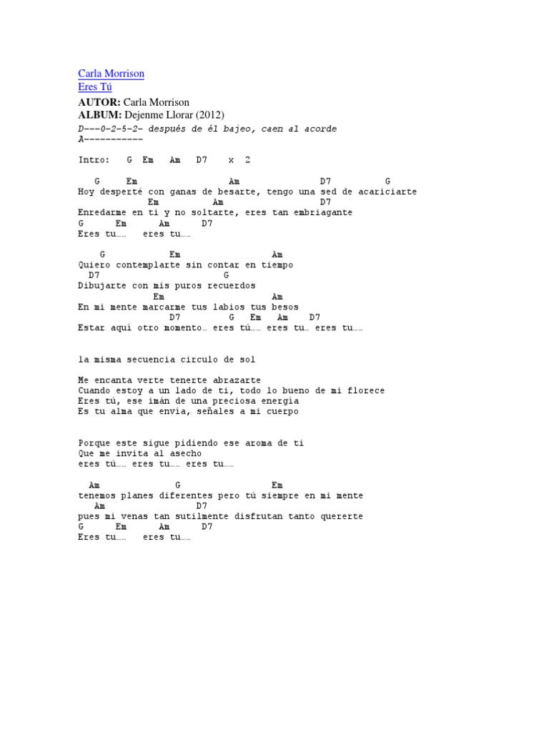 Carla Morrison Eres Tu Acordes : G em am quiero contemplarte sin contar en tiempo d7 g dibujarte con mis puros recuerdos. Carla Morrison Eres Tu Acordes - Play along with guitar, ukulele, or piano with interactive chords and diagrams.